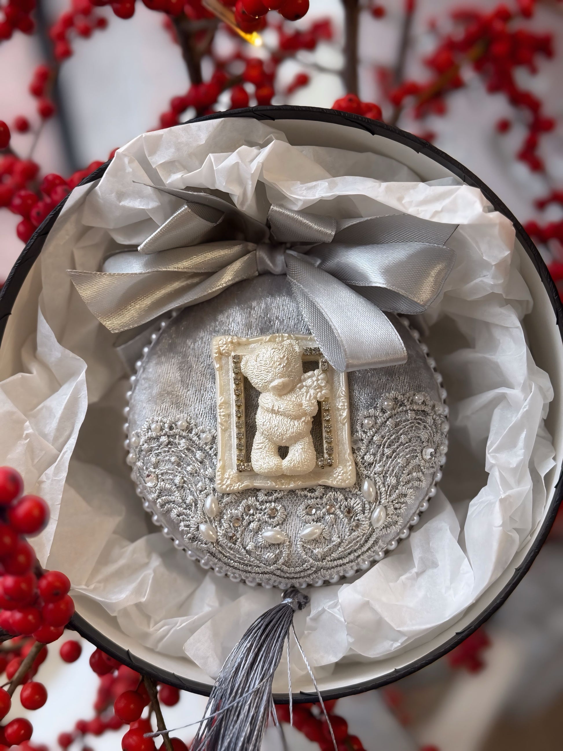 Декорирани с дантела, перли и релефни орнаменти, тези играчки придават изискан и приказен акцент на всяка елха. Идеални за подарък или за специална празнична украса.