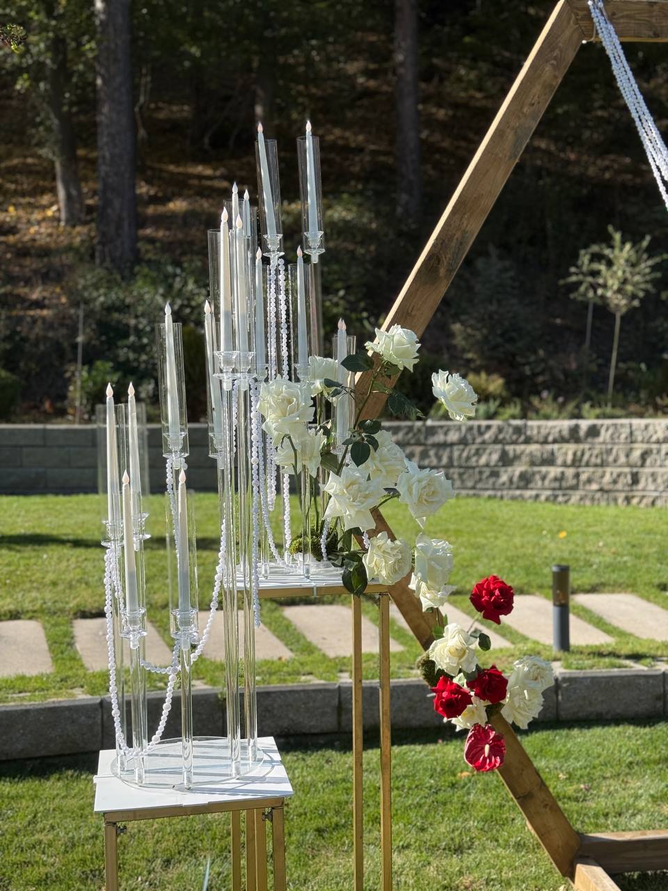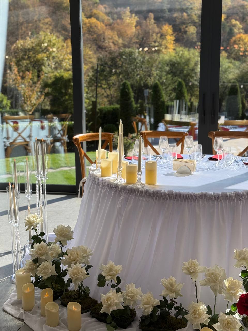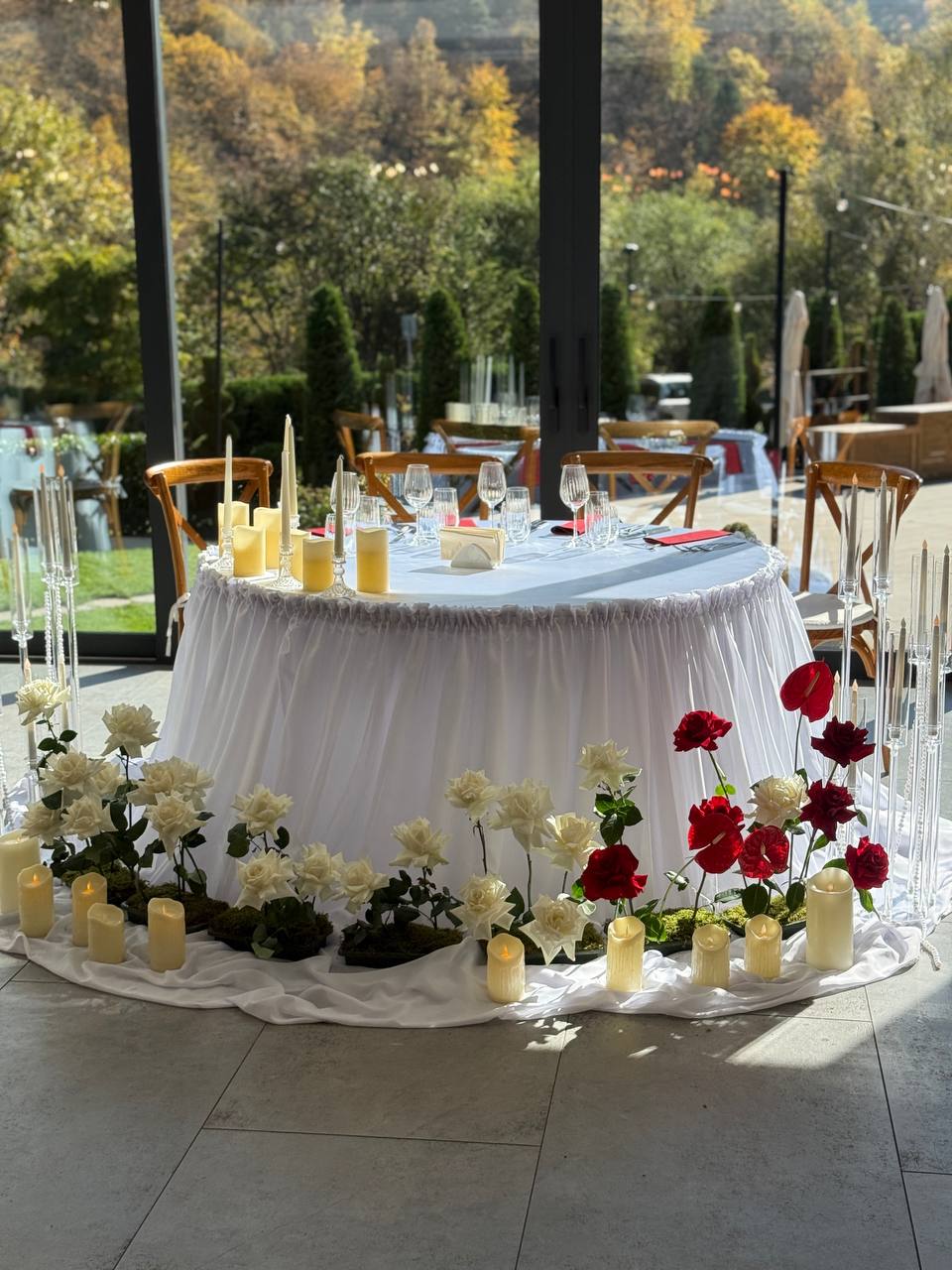 Сватбено оформление с изящни бели и червени рози – символ на чиста любов и страст, преплетени в хармонична цветна история.