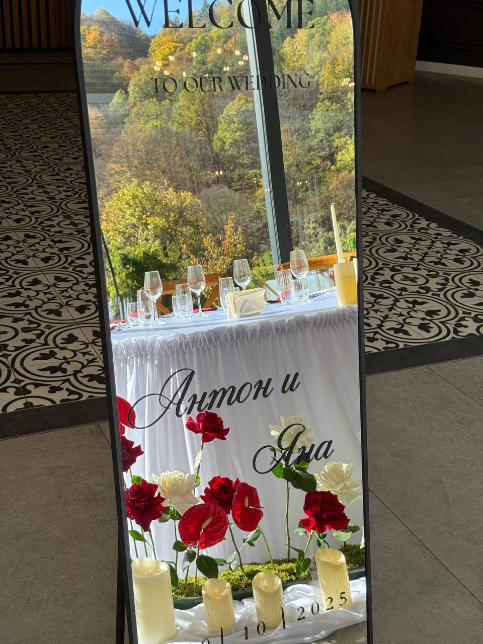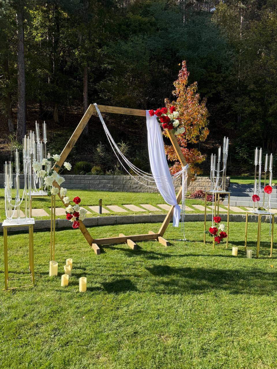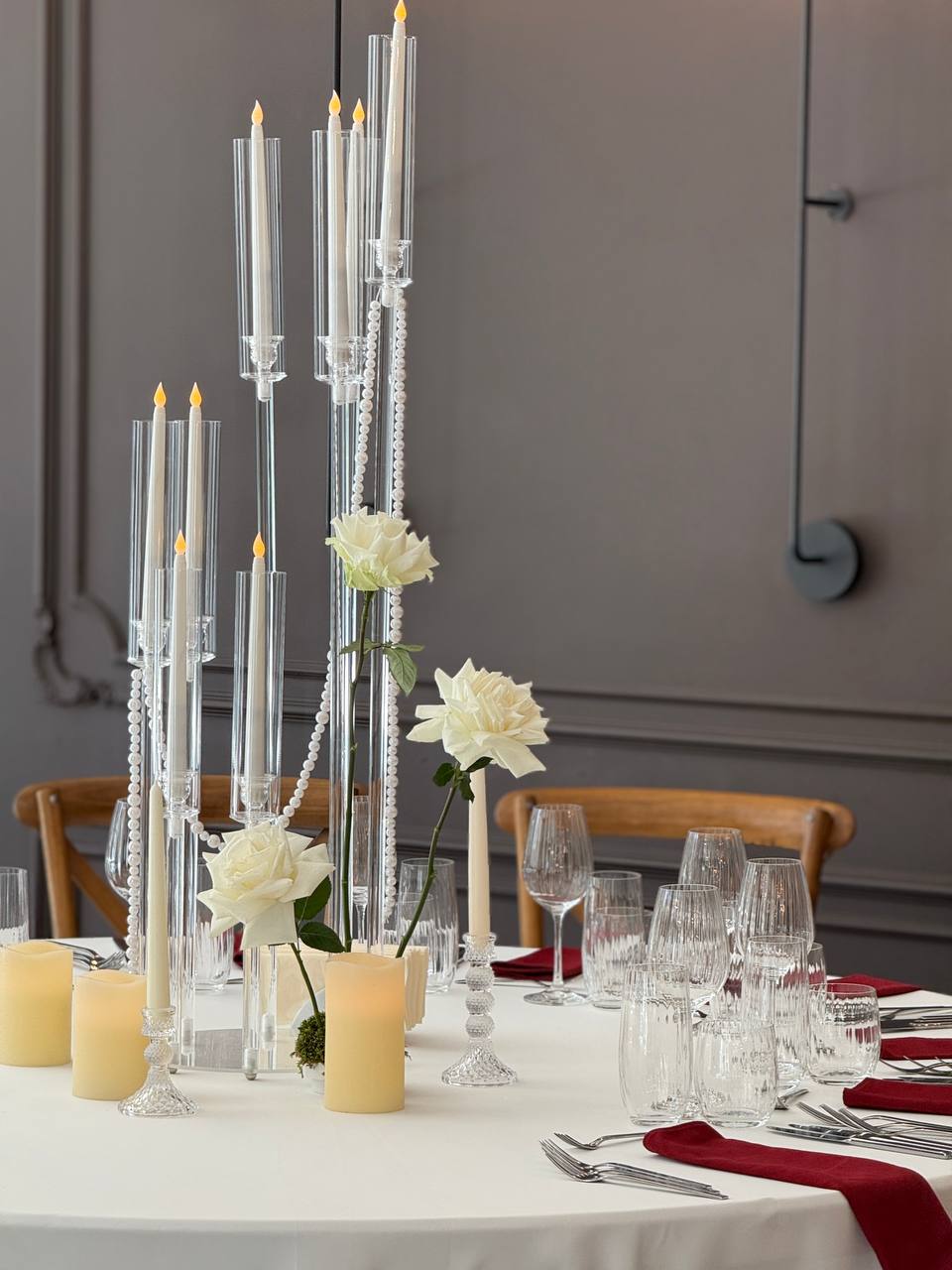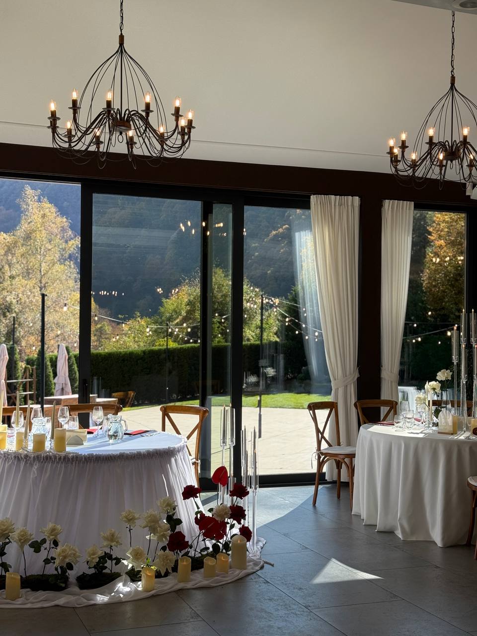 Сватбено оформление с изящни бели и червени рози – символ на чиста любов и страст, преплетени в хармонична цветна история.