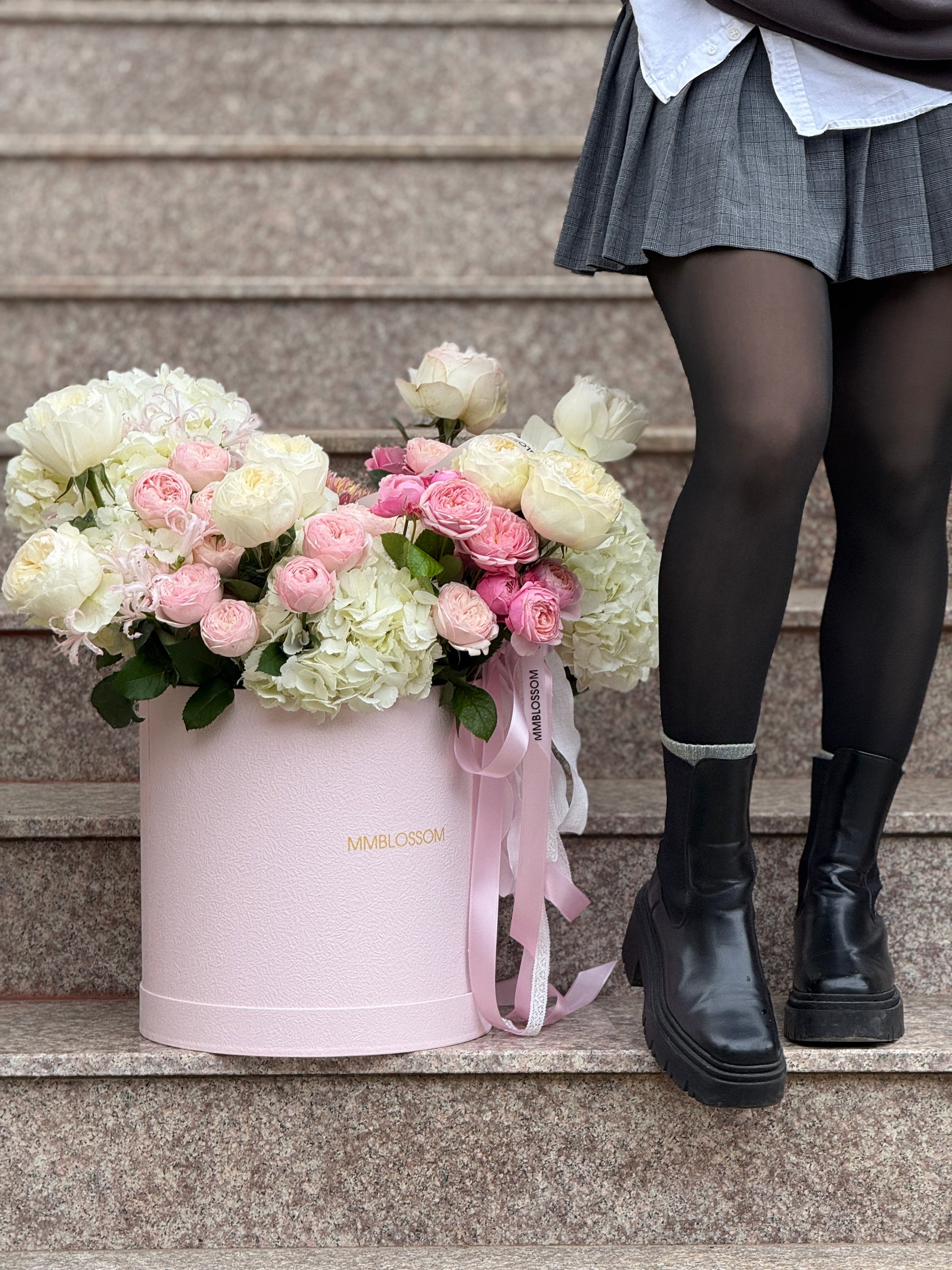 Нежна, ефирна и елегантна – Blush Symphony е цветна кутия, която олицетворява хармонията между любовта и изяществото. Съчетание от кремави хортензии, розови и ванилени рози, събрани в луксозна розова кутия, обвързана с копринени панделки.