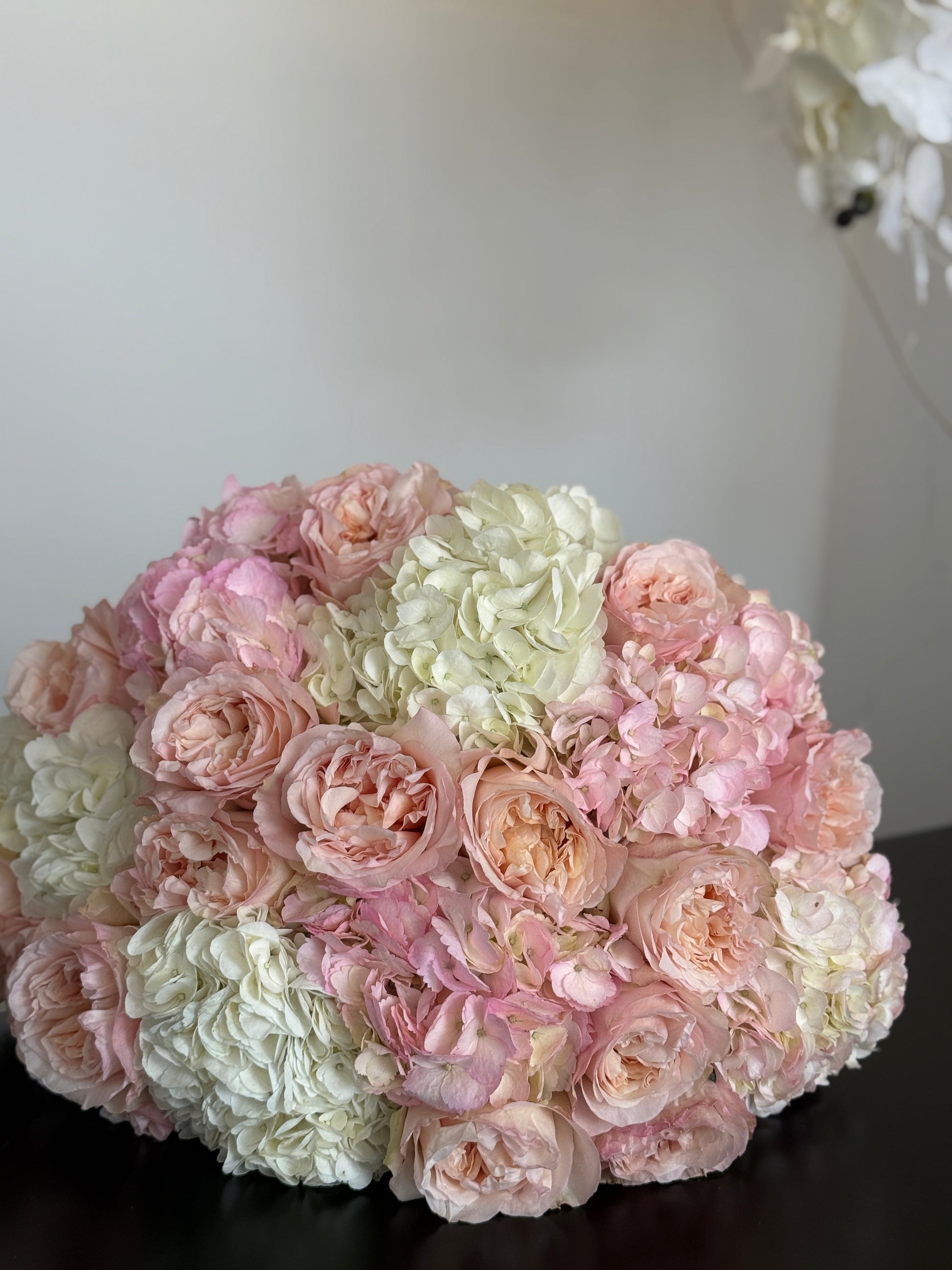 Нежна и изискана комбинация от рози TIE-DYE (TESSA) и ефирна хортензия. Меките розово-кремови нюанси и пищната форма създават усещане за елегантност и романтика — идеален избор за специален повод или като израз на изтънчено внимание.