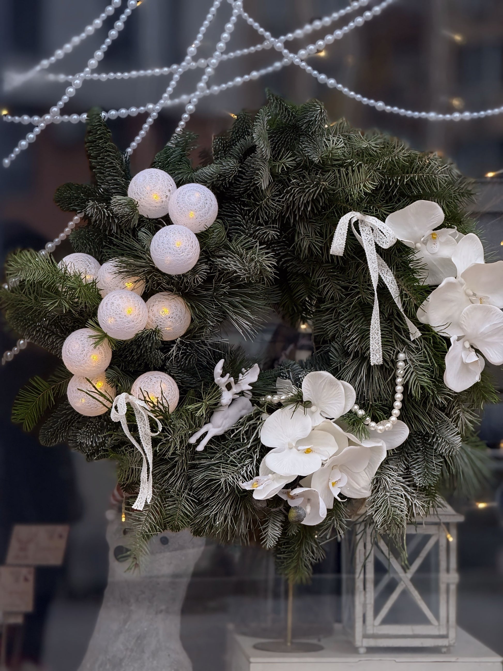 Този очарователен коледен венец впечатлява със своята елегантна зимна визия. Комбинацията от плътни зелени клонки, светещи снежнобели топки и деликатни орхидеи създава усещане за чистота и празнична светлина. Малкият елен, лаковите панделки и нанизите от перли придават допълнителна нежност и приказност. Венецът е изискан акцент, който носи топлина, стил и истинска коледна магия.
